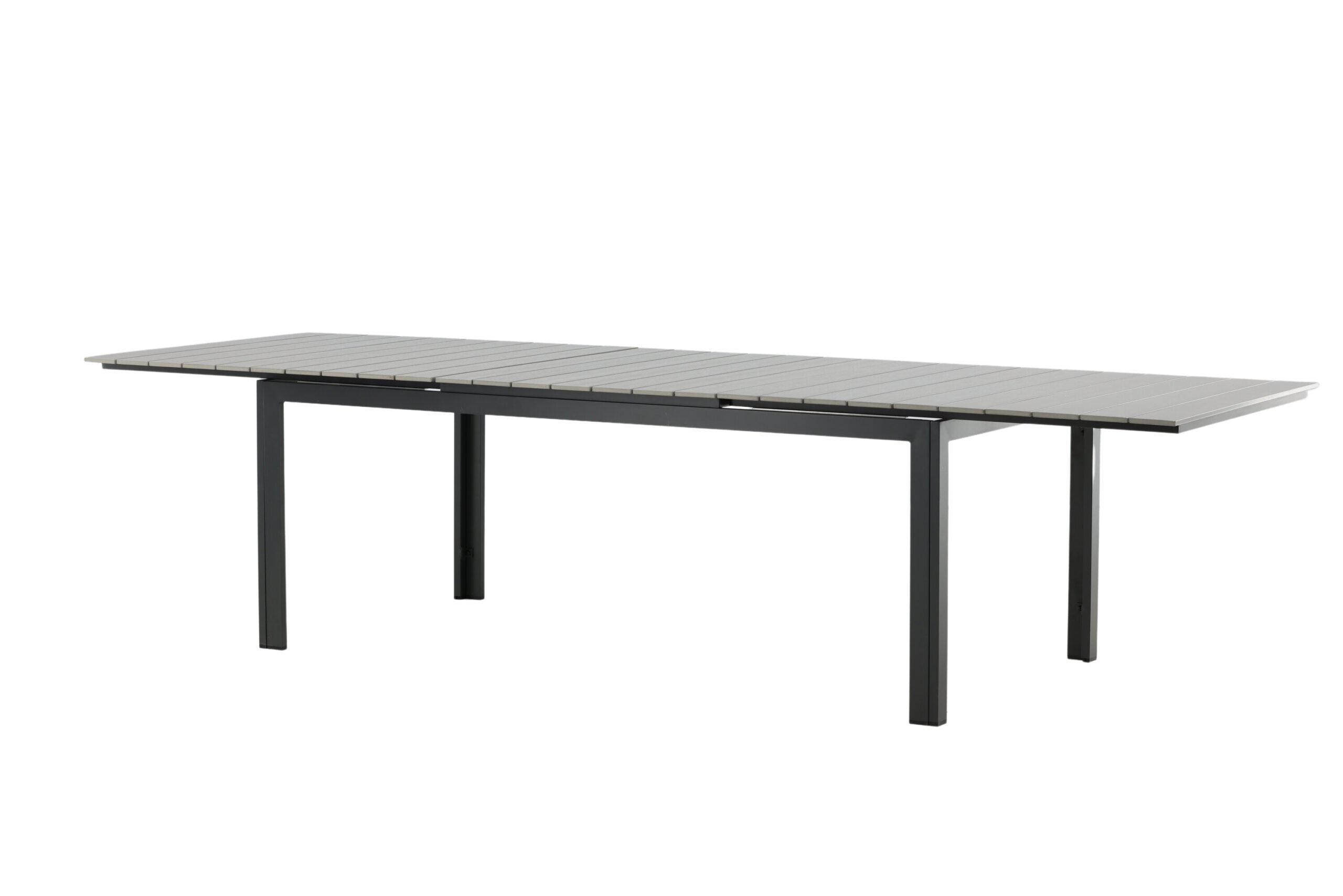 Levels – Ett rektangulärt matbord som går att förlänga vid behov när det behövs fler sittplatser: här får alla nära och kära plats! Bordsskivan är i grå aintwood och bordsbenen i svart metall: två slitstarka material som ger dig ett tåligt matbord för utomhusbruk. Möblera tillsammans med ett par bekväma matstolar så får du en komplett matgrupp till sommarens utomhusmåltider.