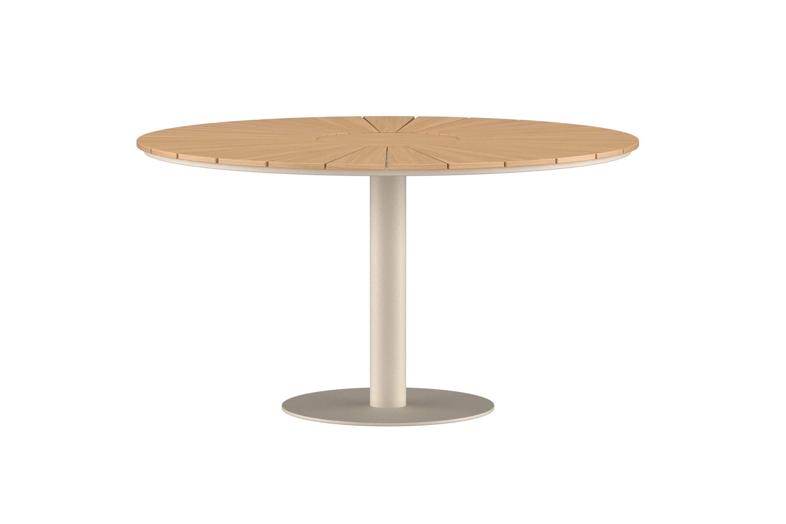 Croft matbord är ett stilrent runt bord tillverkat i aluminium och teak. Bordet mäter 120 cm i diameter och blir en naturlig samlingspunkt för måltider och umgänge. Den vackra teakskivan med sitt solfjädersliknande mönster skapar en exklusiv känsla, medan den stabila pelarfoten i aluminium gör det enkelt och bekvämt att placera stolar runt bordet. Ett modernt och tidlöst val som passar lika bra till vardagsmåltider som till festliga middagar.