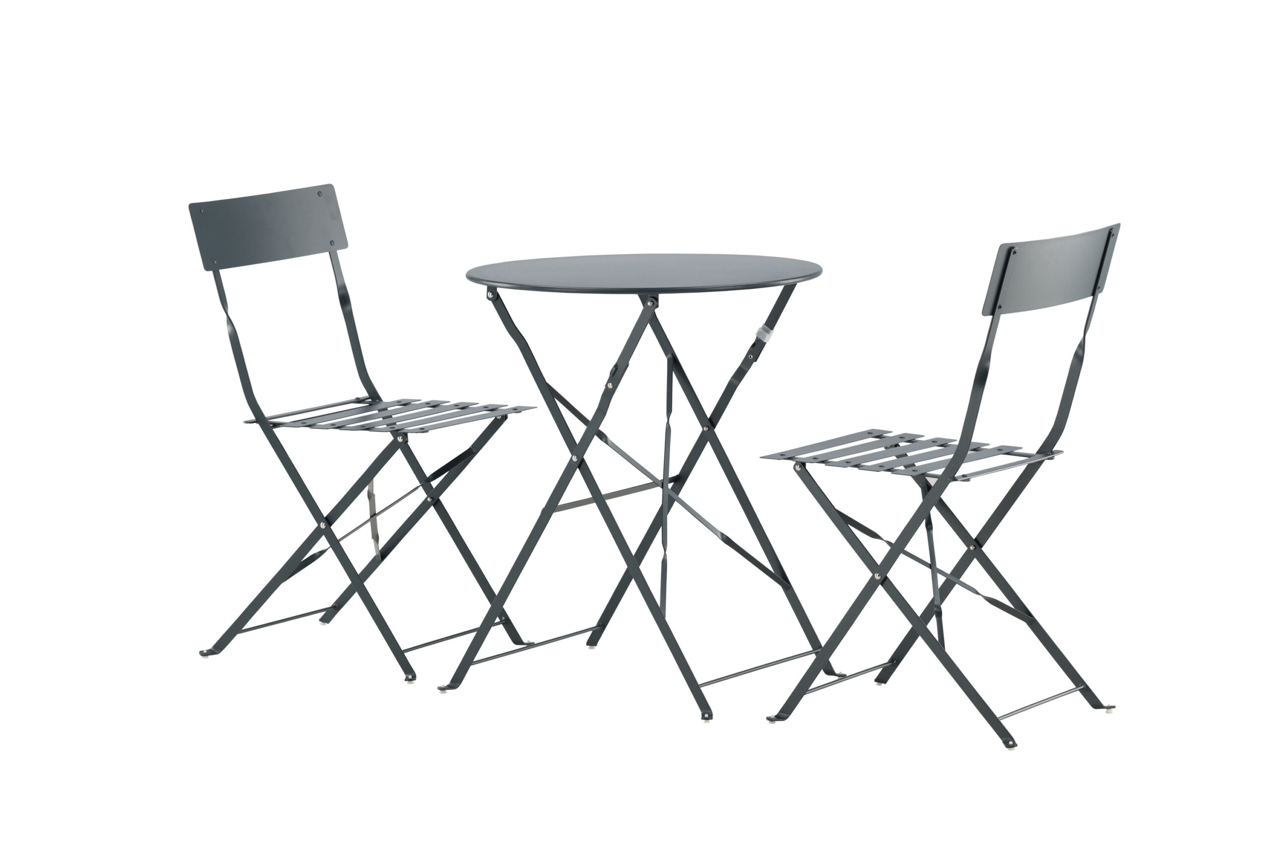 Ett snyggt och smidigt bistroset i mörkgrått som enkelt går att fälla ihop. Både snygg och praktisk så att du får plats över till annat när möblerna inte används. Ta en kopp kaffe och njut här från vår till höst!