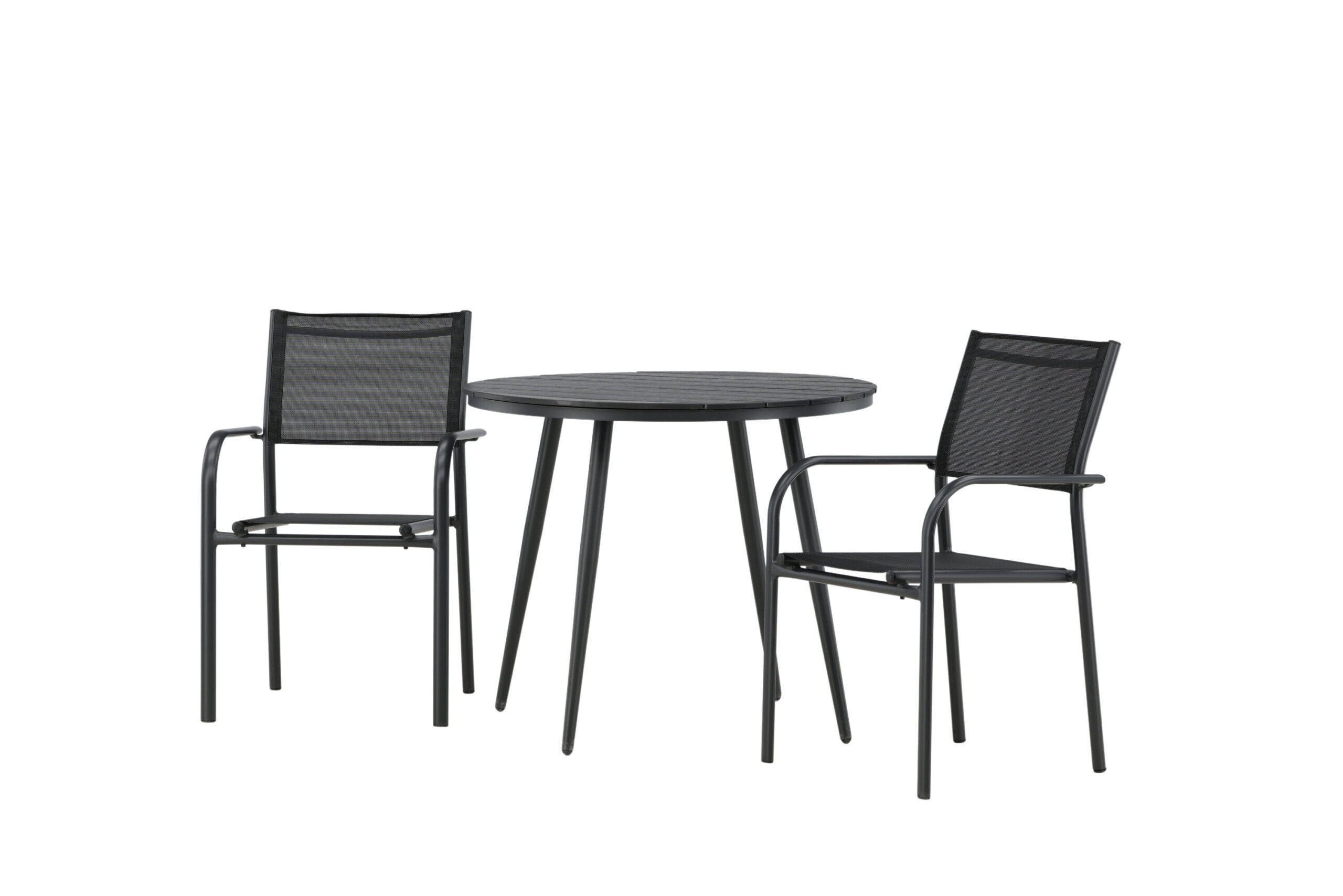 Den perfekta fikaplatsen i sommar! Bordet Break har ett klassiskt utförande med en rund bordsskiva i aintwood och ett underrede i svart aluminium. Mått: 90ø cm. Här i modern kombination med 2st svarta matstolar från serien Santorini. Stolarna har raka nordiska former med integrerade armstöd i aluminium och en sits i svart textilene. De är även stapelbara för praktisk förvaring. Skapa en mysig matplats på uteplatsen!