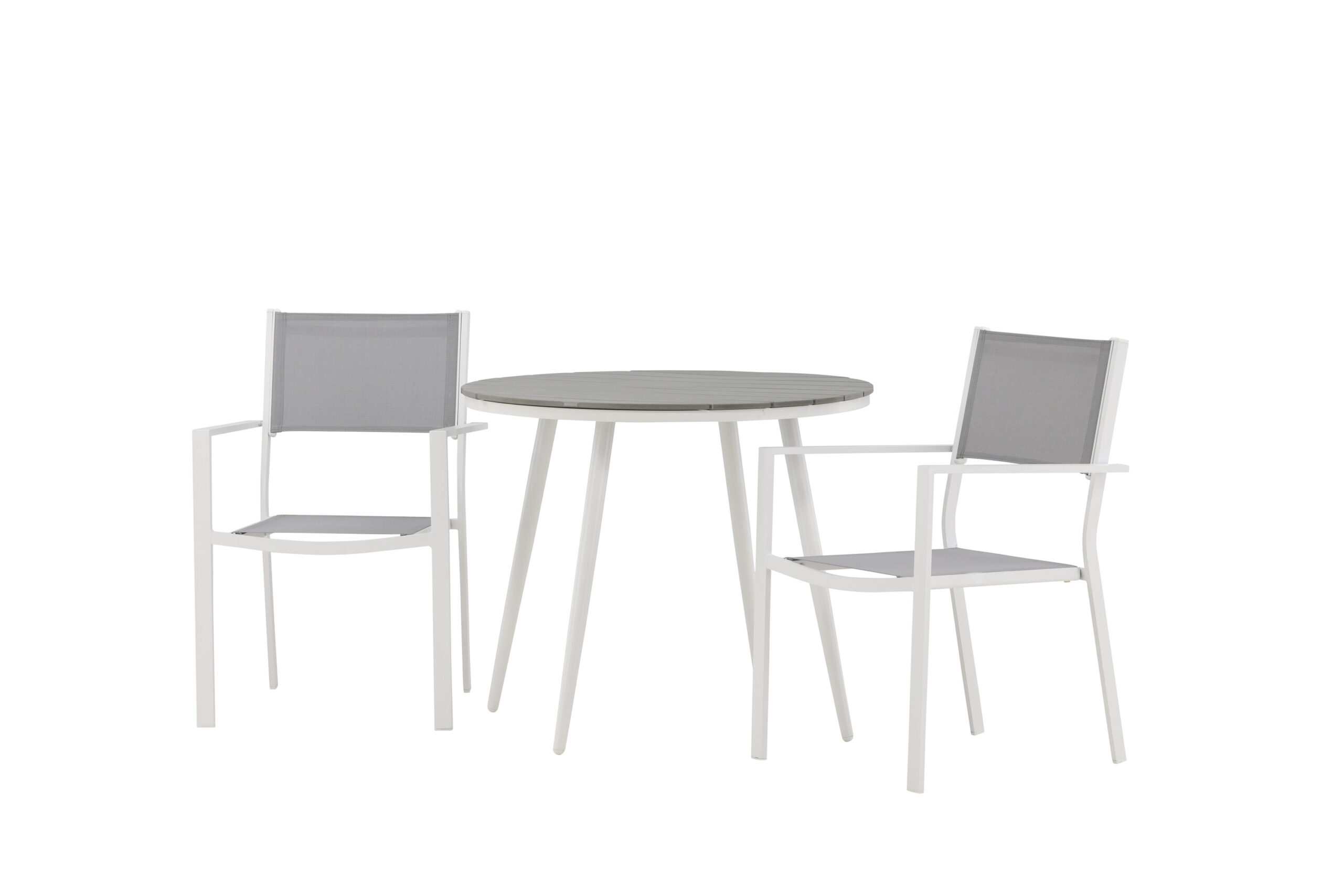 En inbjudande matgrupp för två som garanterat förlänger trivsamma stunder i sommar! Bordet Break har en rund bordsskiva i grå aintwood och ett klassiskt underrede i vit aluminium. Mått: 90ø cm. Här tillsammans med trendsäkra matstolar från serien Copacabana i modern design. Stolarna är stapelbara med en sits i textilene och ram i aluminium. Skapa en charmig plats för sommarens alla tillfällen!