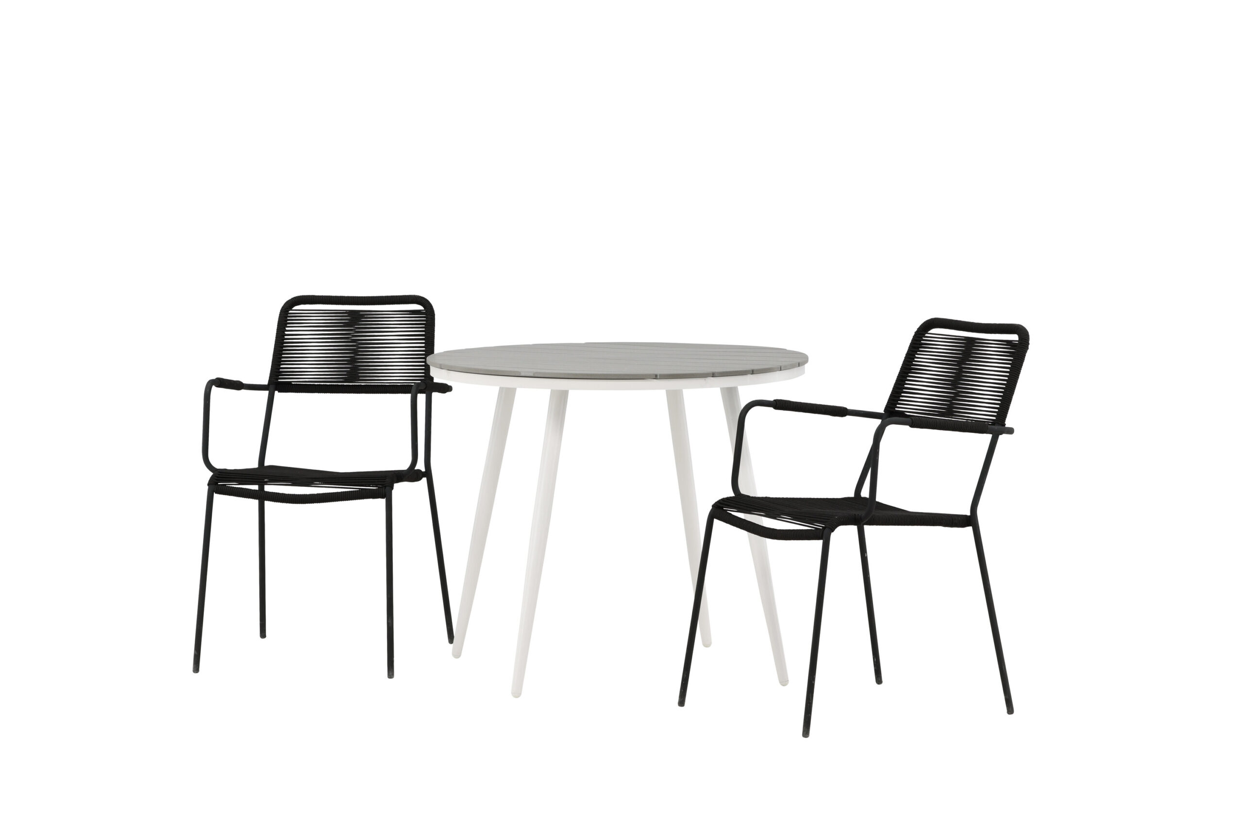 Bekväm, inbjudande och nätt cafégrupp i svart kulör passar perfekt till uteplatsen i sommar! Bordet Break har en rund bordsskiva i grå aintwood och ett klassiskt underrede i vit aluminium. Här i perfekt kombination med smäckra stolar från serien Lindos. Stolarna har stilrent smala ben och integrerade armstöd i svart aluminium och en sits i slitstarkt, svart rep. Det här är en inbjudande matgrupp för två som garanterat förlänger trivsamma stunder i sommar!