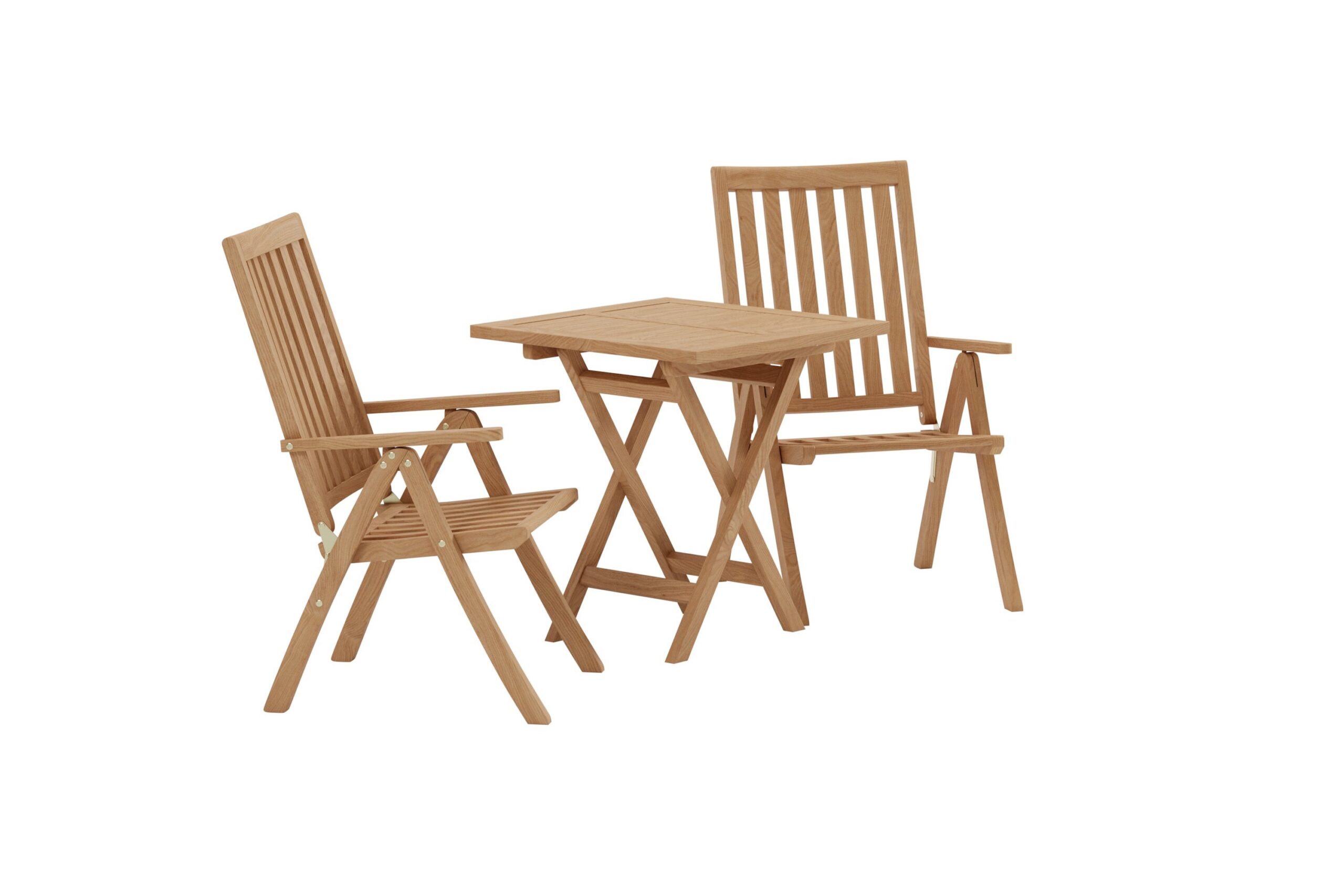 Skapa ett stilfullt blickfång på uteplatsen med denna charmiga matgrupp från serien Kenya. Här kombineras två eleganta matstolar i massiv teak med ett praktiskt, kvadratiskt cafébord i samma vackra träslag – perfekt för den mindre altanen, balkongen eller trädgårdshörnan. Kenya matstol har en tidlös ribbad design med bekväma armstöd som gör varje sittstund extra skön. Ryggstödet kan justeras i flera lägen, vilket ger möjlighet till både upprätt sittande vid måltider och mer avslappnade stunder i solen. En stol som snabbt blir en favorit tack vare sin kombination av design, funktion och komfort. Det hopfällbara cafébordet i teak är lika vackert som praktiskt. Den kvadratiska formen och lätta konstruktionen gör det enkelt att flytta, förvara och anpassa efter dagens behov. Perfekt för morgonkaffet, lunch i solen eller en mysig fika på kvällen.