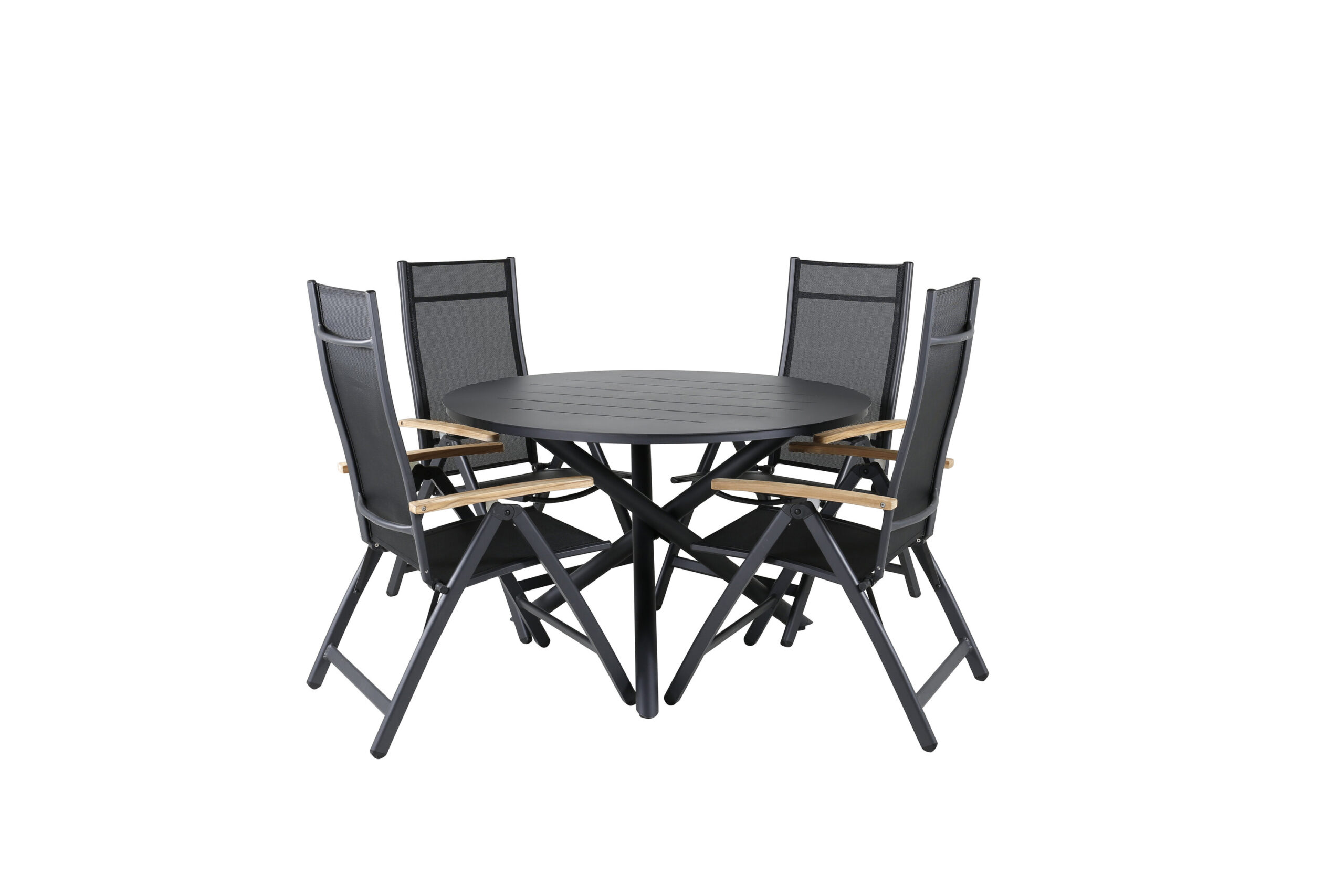 Stilren, modern och praktisk – en matgrupp som imponerar! Vårt runda matbord Alma i svart aluminium ser till att ingen hamnar på kanten. Här tillsammans med våra justerbara svarta matstolar från serien Panama. Stolarna är tillverkade i textilene med läckra detaljer i teak som skapar ett lyxigt blickfång. Bjud hem familj och vänner och njut av härliga måltider tillsammans!