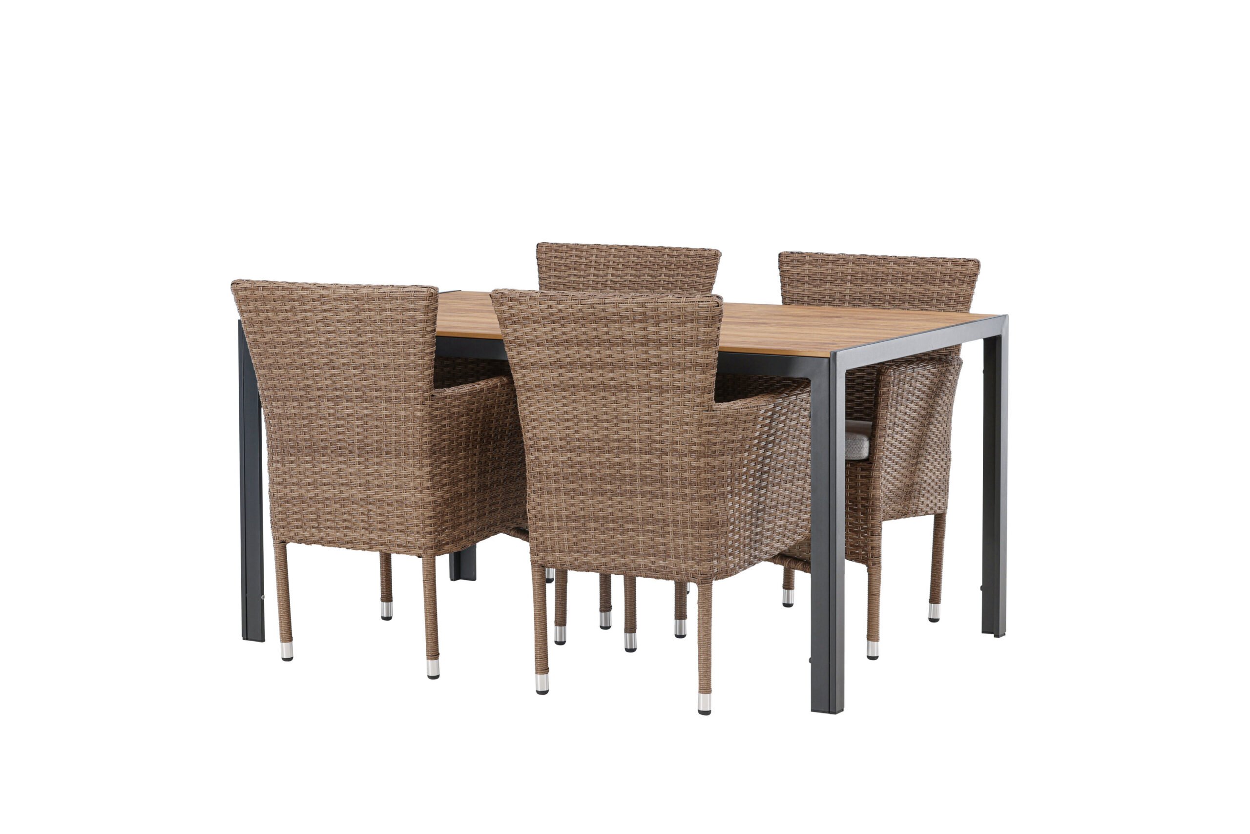 Den här matgruppen imponerar med sitt trendsäkra blickfång och höga komfort! Vårt rektangulära matbord Break har raka former i klassisk nordisk design med en bordsskiva i plywood och bordsben i svart aluminium. Matstolarna tillhör serien Malina och står sig garanterat över tid. Stolen har en stomme i aluminium och är klädd i korgflätad, beige konstrotting. Bjud in till många härliga måltider utomhus framöver! Bordets mått: 150×90.