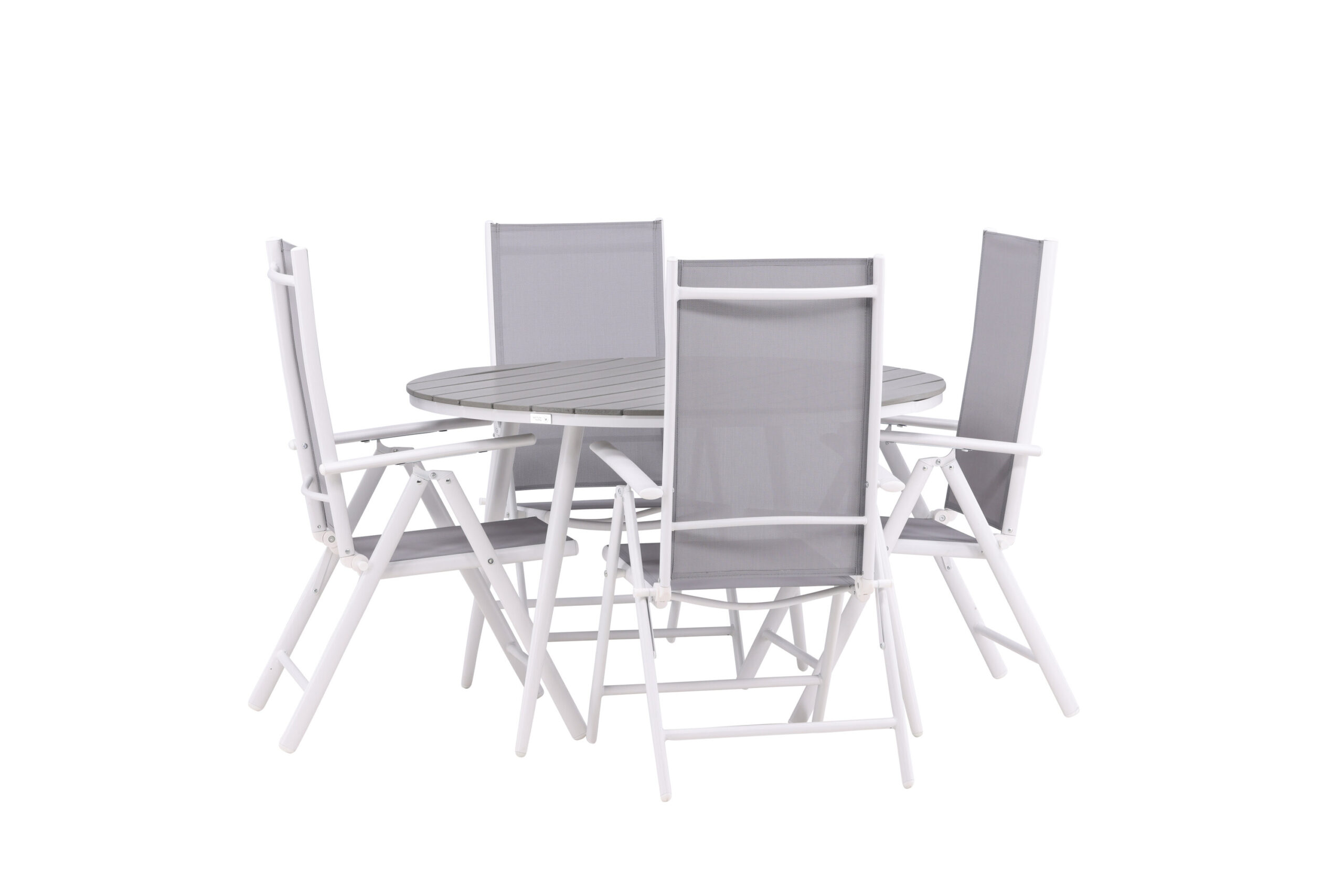 En matgrupp i klassisk design och smäcker färgskala går aldrig ur tiden – enkel att matcha och tidlös i sitt utformande! Bordet Break har en rund bordsskiva i grå aintwood och ett klassiskt underrede i vit aluminium. Här i perfekt kombination med fällbara matstolar från samma serie. Stolarnas ryggstöd i grå textilene går att justera för optimal komfort och avkoppling kring matbordet. Skapa den perfekta mittpunkten på din altan!