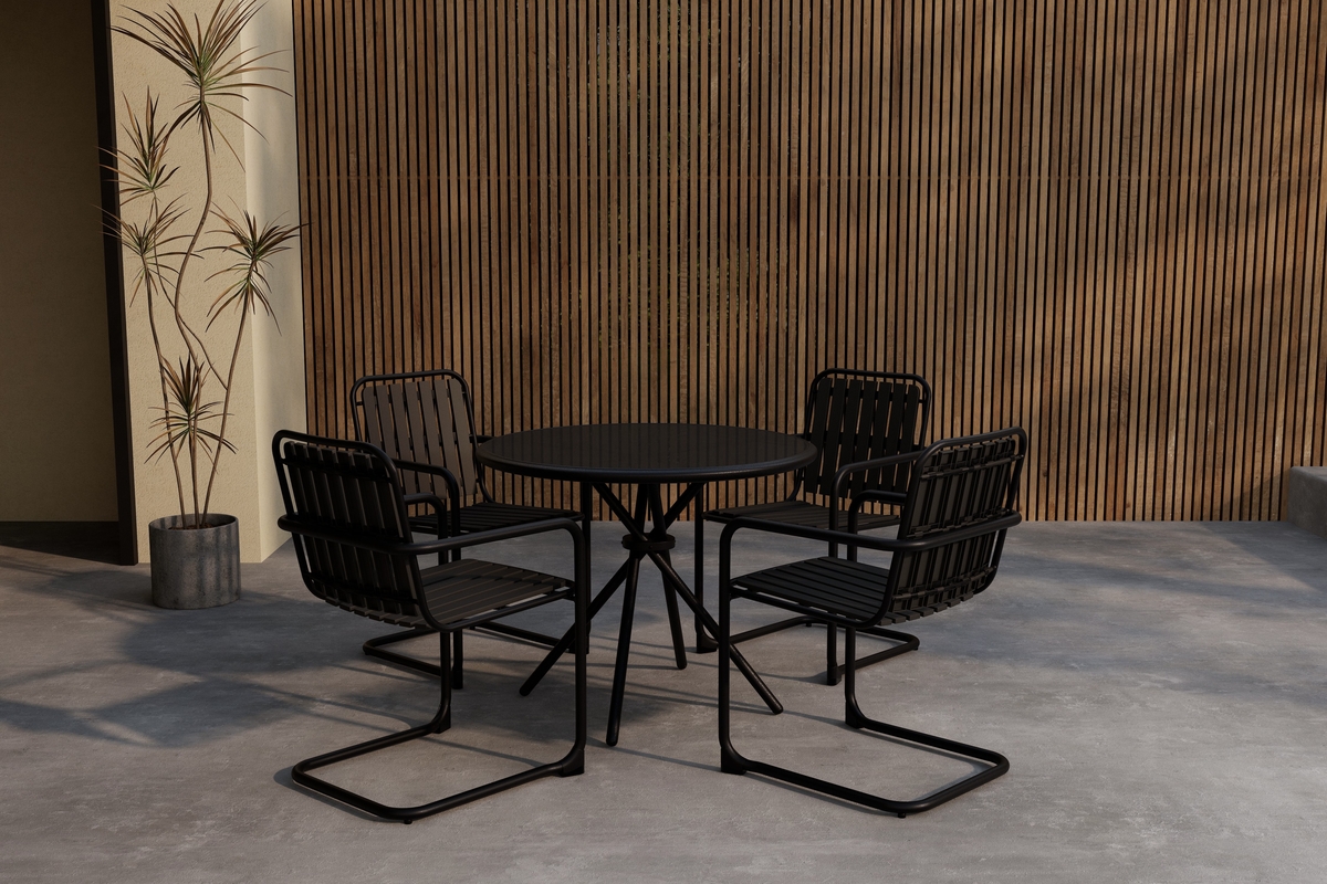 Chios är en modern matgrupp i svart som kombinerar stilren design med funktion. Med ett runt bord och fyra bekväma stolar blir detta en perfekt lösning för uteplats, altan eller balkong. Den eleganta formen och den flätade designen gör att du sitter bekvämt – länge.