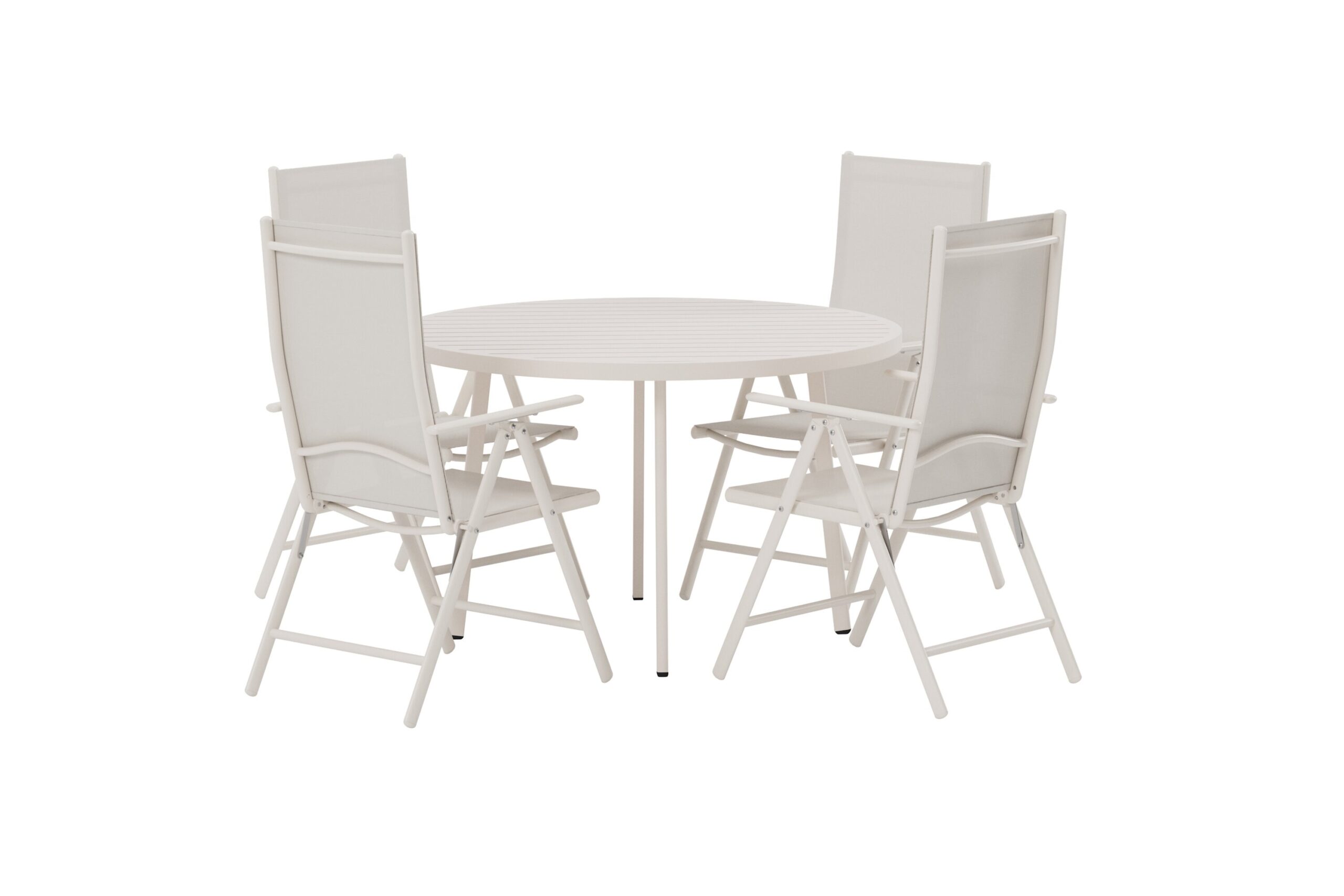 Skapa en stilfull och inbjudande matplats utomhus med denna eleganta kombination av Break positionsstolar och det runda Giardini matbordet. Break positionsstol kombinerar modern design med hög funktionalitet. Den eleganta beige färgen och den slitstarka aluminiumramen ger ett harmoniskt uttryck, medan sitsen i tåligt textilene ger skön komfort. Stolen är både ihopfällbar och utrustad med justerbart ryggstöd – perfekt för såväl måltider som avkopplande stunder. Giardini matbord är ett vackert runt bord i stilren beige med en diameter på 120 cm. Den ribbade bordsskivan ger extra karaktär, och den runda formen skapar en naturlig samlingspunkt på altanen eller i trädgården. Ett bord som passar lika fint i moderna som i klassiska utomhusmiljöer. Tillsammans bildar Break och Giardini en harmonisk, praktisk och attraktiv matgrupp – idealisk för härliga stunder utomhus i sommar.