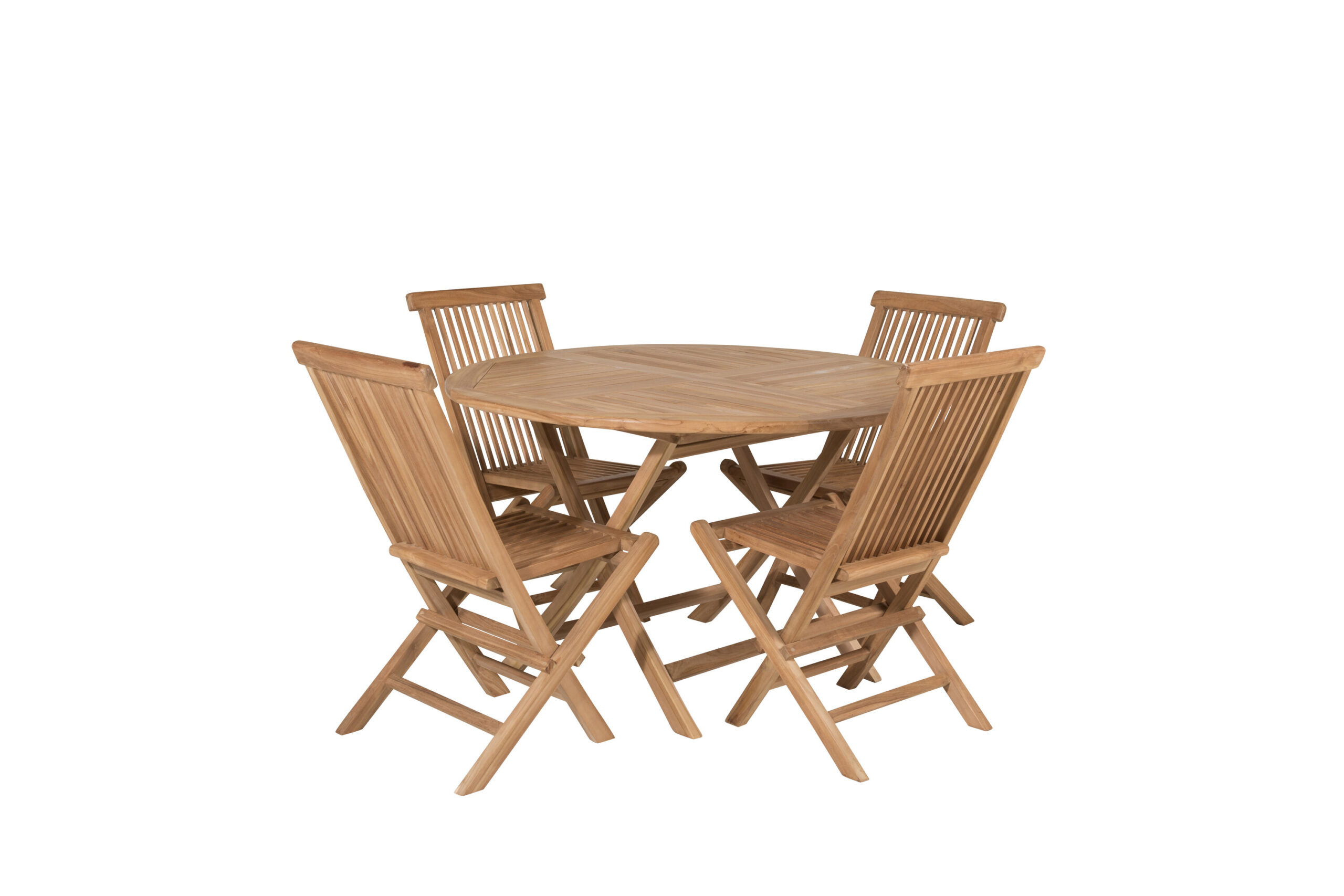Skapa en charmig atmosfär på uteplatsen med en familjär matgrupp! Vårt runda matbord Kenya ser till att ingen hamnar på kanten och imponerar med sin smakfulla, skandinaviska design. Bordet är tillverkat i det vackra materialet teak och har ett ribbat utförande. Mått: 120ø. Här tillsammans med 4st av våra hopfällbara matstolar från serien Kenya. Stolarna är också i teak och matchar bordet utmärkt. Duka ut middagen och njut av en trivsam måltid i en läcker matgrupp!