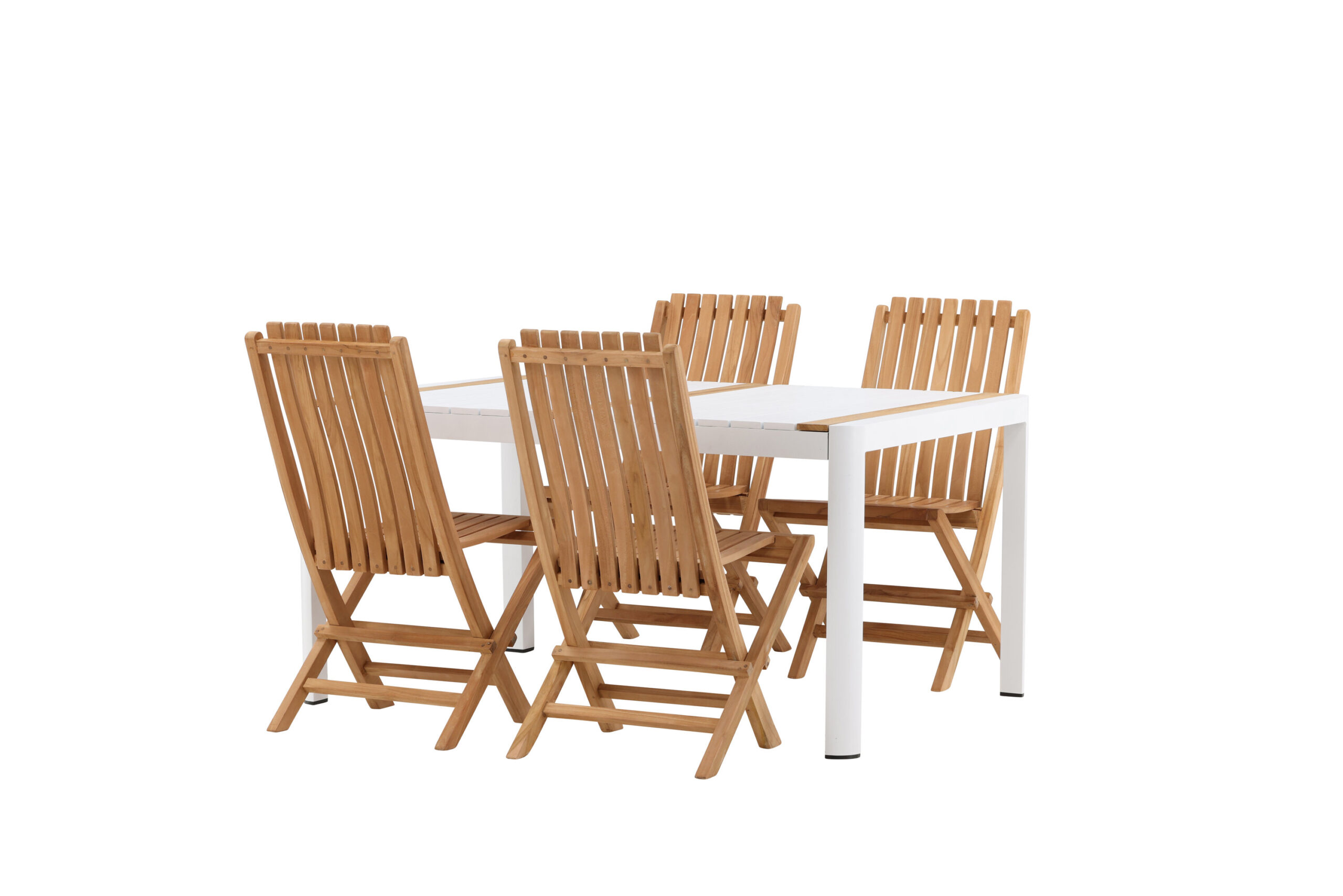 Skapa ett elegant blickfång som imponerar – den här matgruppen är lika iögonfallande som slitstark! Matbord Togo har ett smakfullt utförande med en rektangulär bordsskiva i vit och träfärgad teak och ett underrede i vit aluminium. De läckra teak-detaljerna i bordsskivan gör att bordet matchar utmärkt med matstolarna från serien Ghana. Stolarna är hopfällbara och tillverkade i smakfull teak i en ribbad design som ger ett väldigt modernt intryck. Låt tiden här bli dagens höjdpunkt!