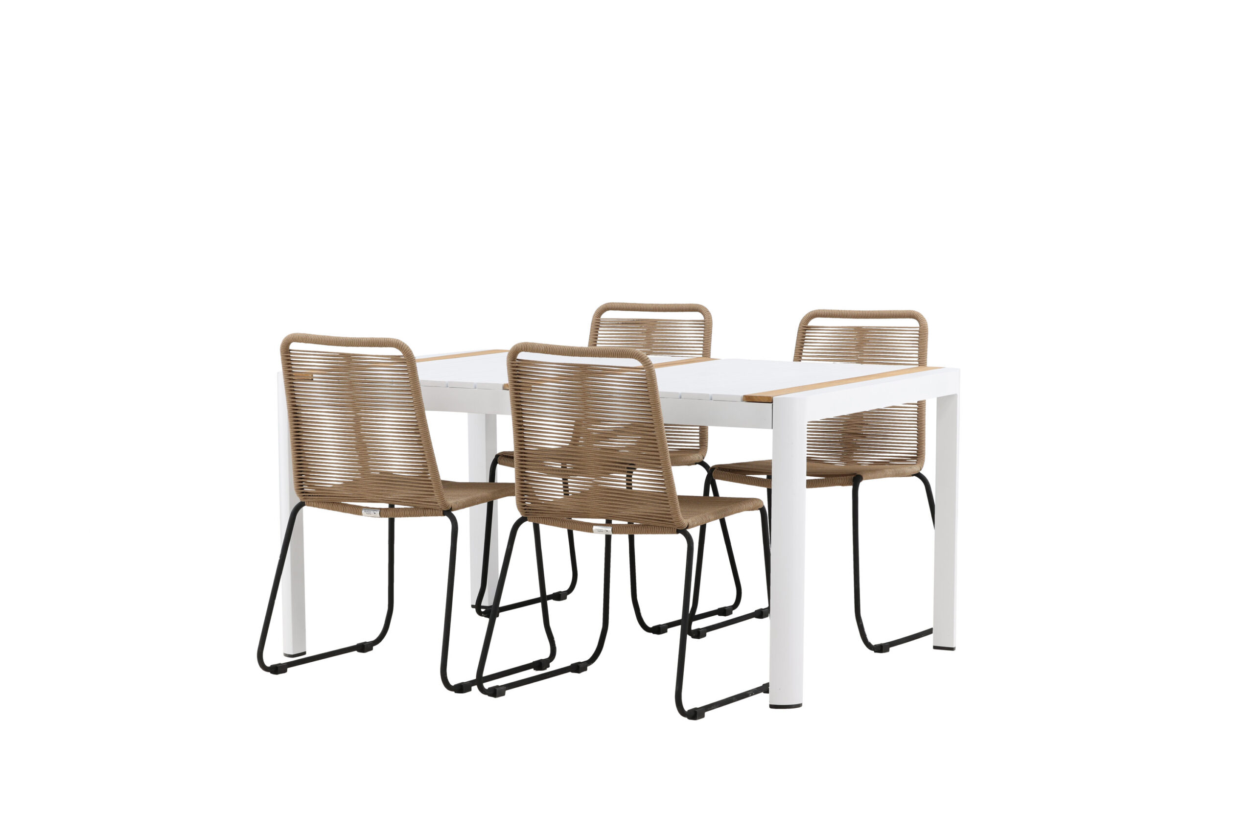 Skapa ett trendsäkert blickfång i varma kulörer som imponerar – den här matgruppen är lika iögonfallande som slitstark! Matbord Togo har ett smakfullt utförande med en rektangulär bordsskiva i vit och träfärgad teak och ett underrede i vit aluminium. Mått: 150×100 cm. Här i modern kombination med lattefärgade matstolar från serien Lindos. Stolarna har stilrent smala ben i svart aluminium och en sits i slitstarkt beige rep. Den jordnära kulören ger ett varmt intryck till möblemanget. Bjud in till många trivsamma måltider framöver!