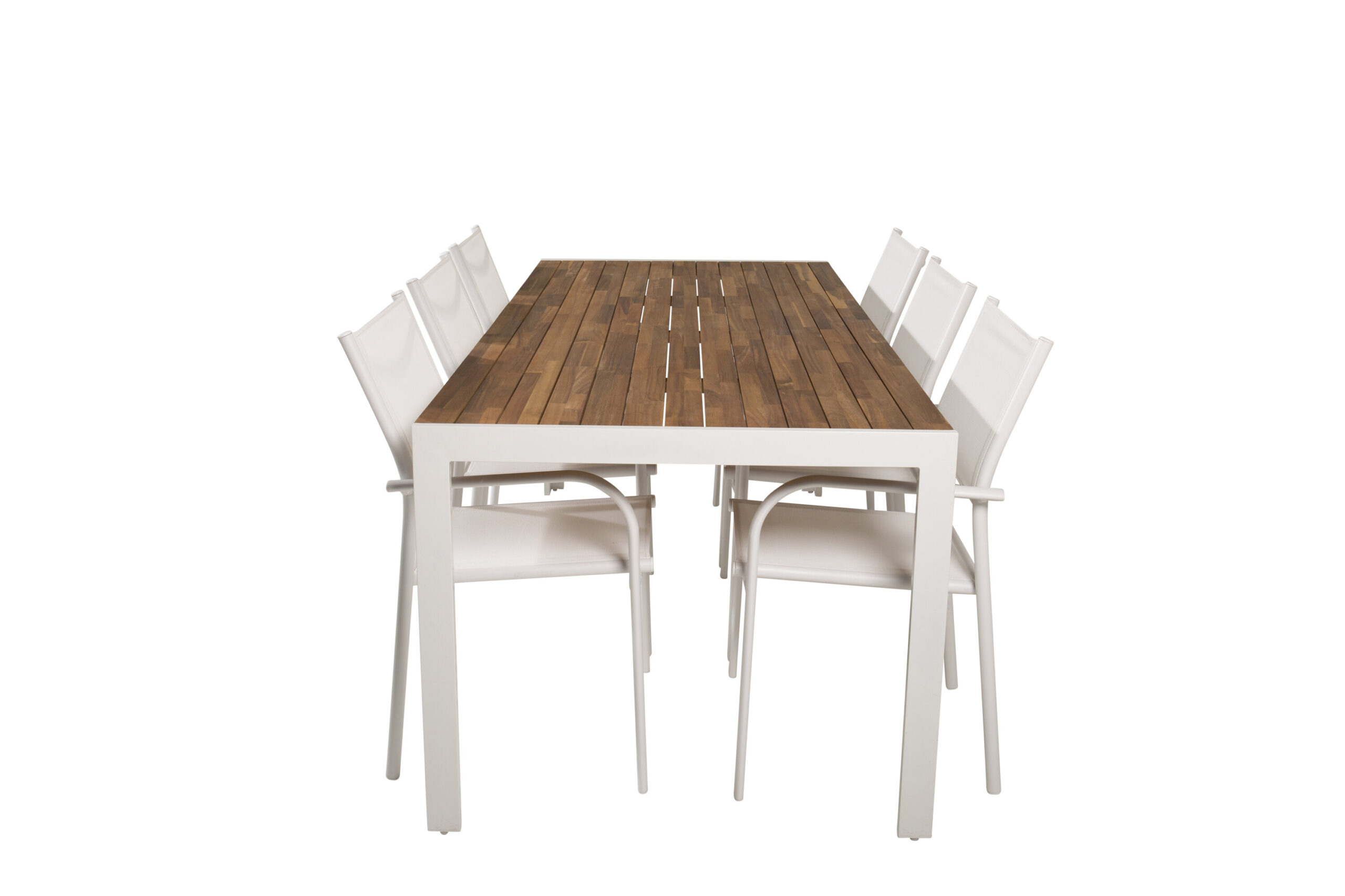 Bois matbord i en vit aluminiumkonstruktion tillsammans med våra stapelbara matstolar Santorini. Gör plats för långa och bekväma sommarmiddagar!