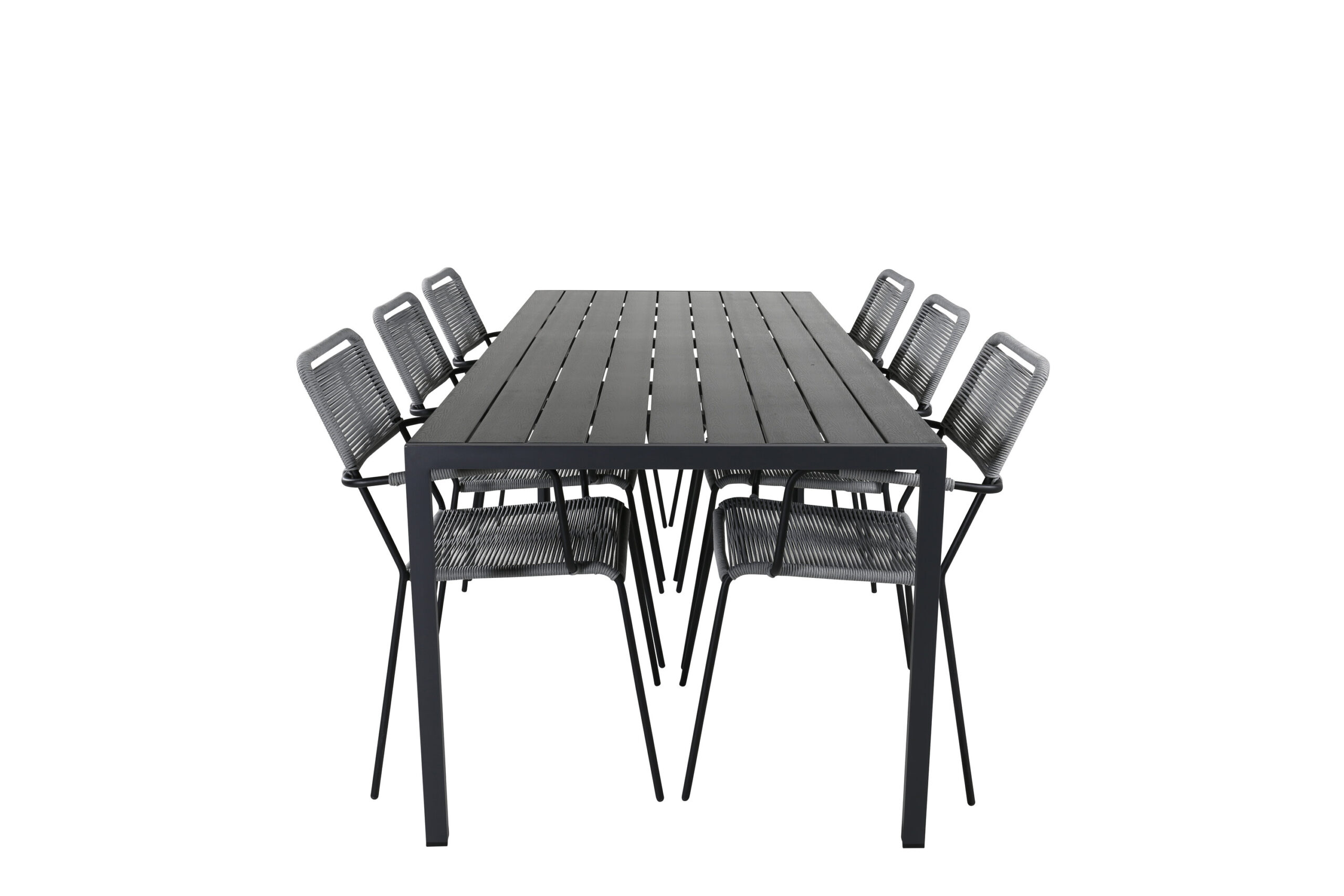 Matgrupp Utomhus – Venture Home Break Matbord 205×90 Svart + 6 Lindos Karmstolar Svart/Grå