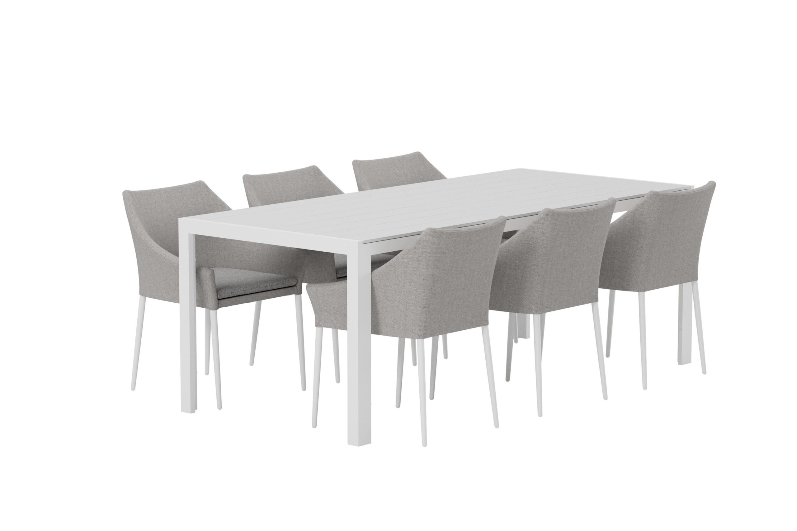 Skapa en modern och inbjudande utomhusmiljö med denna stilfulla matgrupp som kombinerar Break-bordet med 6 Spoga karmstolar. Spoga karmstol är en bekväm och snygg stol med tuff helklädd design i grått polyestertyg och ben i vit pulverlackerad metall. De integrerade armstöden och det generösa sittdjupet ger en skön sittupplevelse – perfekt för långa, avkopplande måltider på uteplatsen eller i uterummet. Break-bordet har en modern och enkel design i vit aluminium och slitstark aintwood. Den rektangulära formen och den rymliga bordsskivan gör det till ett praktiskt och stilrent val som passar i de flesta utomhusmiljöer. Bordets tidlösa uttryck gör det lätt att matcha och skapar en fräsch och harmonisk känsla. Tillsammans formar Spoga-stolarna och Break-bordet en elegant och funktionell matgrupp som lyfter din uteplats och bjuder in till härliga stunder utomhus.