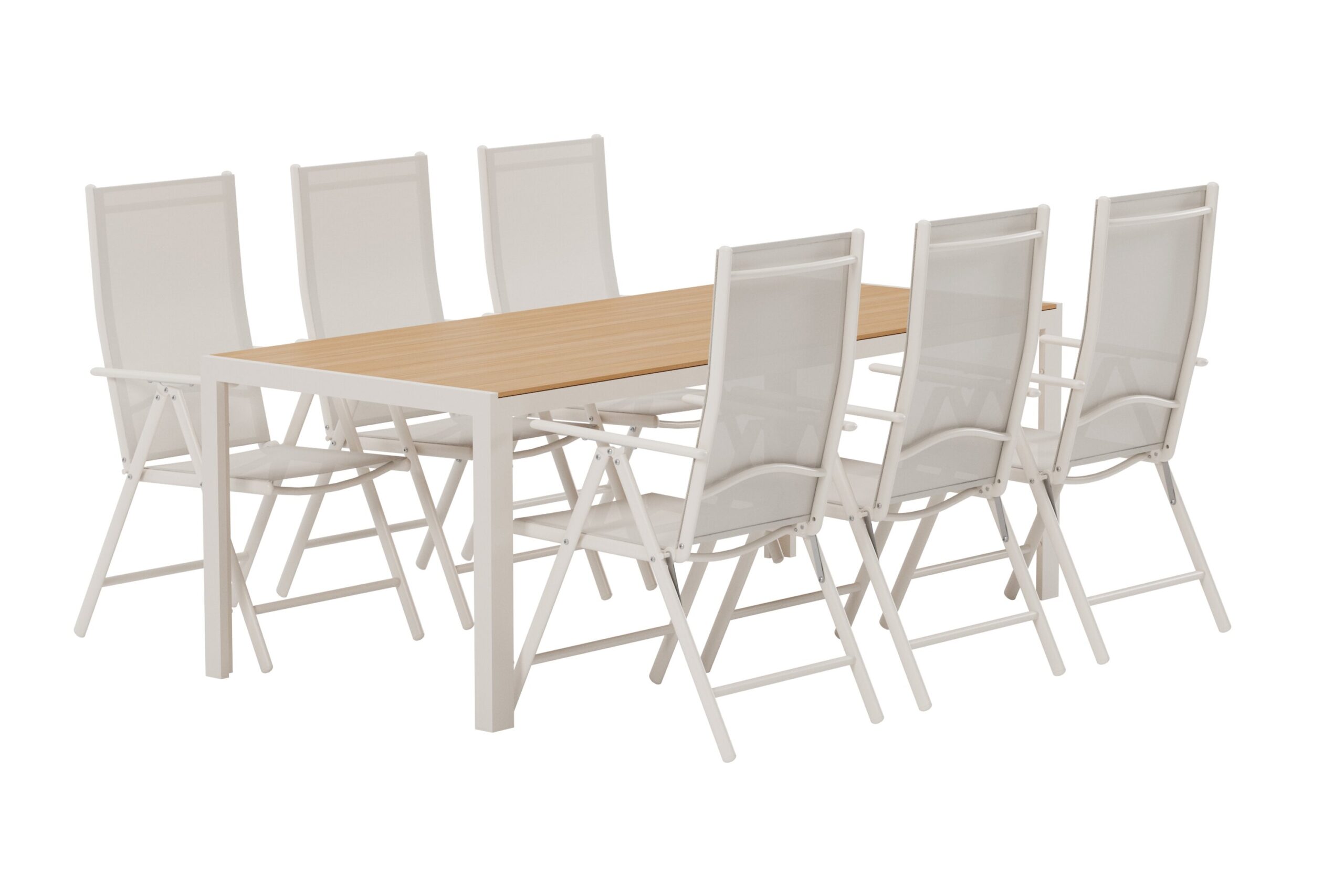 Skapa en harmonisk och funktionell matplats utomhus med denna eleganta matgrupp i Break-serien. Break positionsstol kombinerar modern design med hög komfort. Den stilrena beige färgen, den slitstarka aluminiumramen och sitsen i tåligt textilene ger en lättskött och bekväm stol för alla tillfällen. Tack vare både ihopfällbar konstruktion och justerbart ryggstöd passar stolen lika bra för långa middagar som för avkopplande stunder i solen. Break matbord är ett rymligt och stilfullt bord i beige med måtten 205×90 cm. Bordet har en vacker bordsskiva i teaklook och en stabil konstruktion som gör det både hållbart och lätt att placera. Den neutrala färgen gör bordet enkelt att matcha med olika stilar och skapar en varm och inbjudande känsla på uteplatsen.