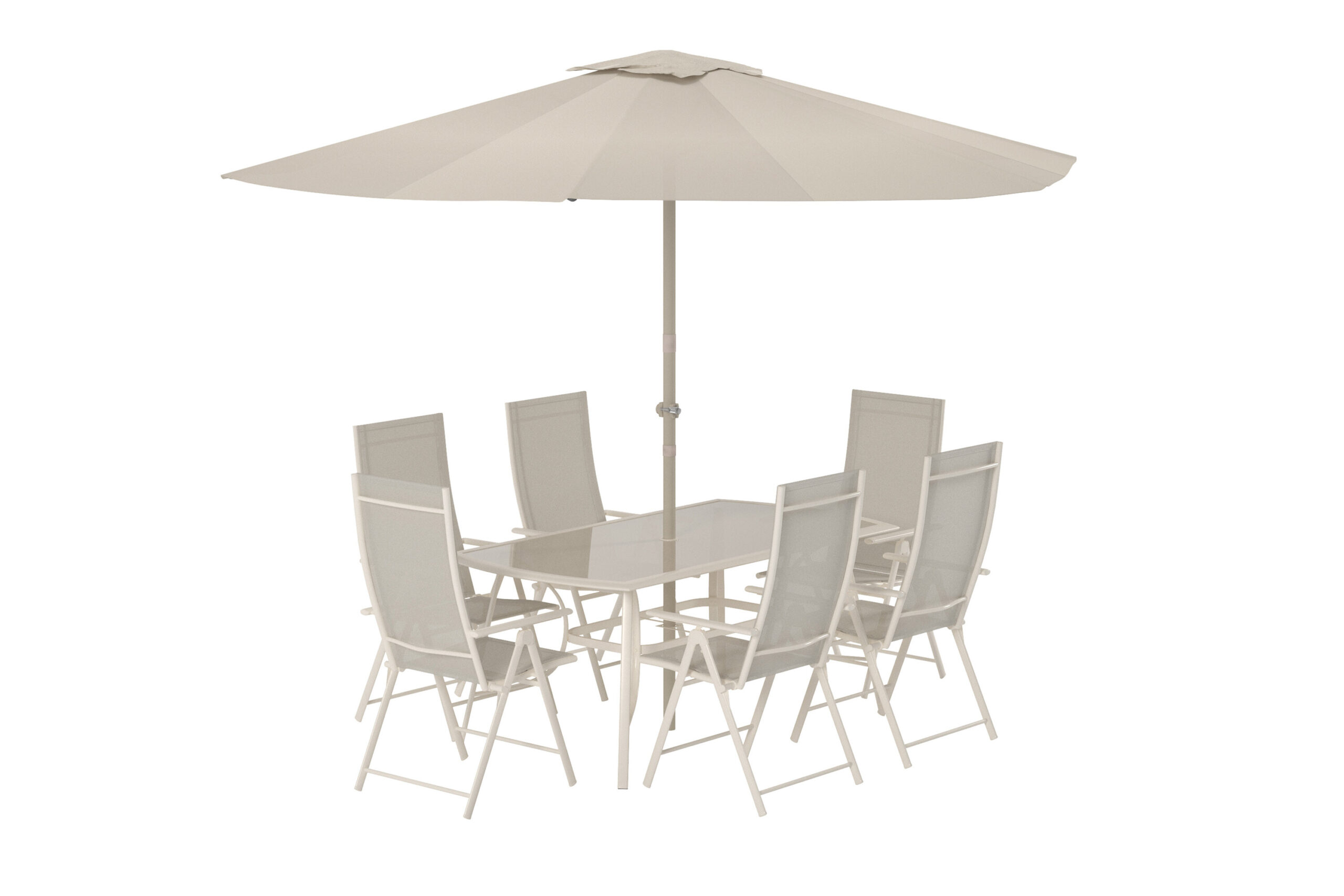 Skapa den perfekta platsen för sommarens måltider och umgänge med Brekki matgrupp. Setet består av ett rymligt matbord med glasskiva, sex bekväma positionsstolar och ett stilrent parasoll som ger skön skugga under soliga dagar.