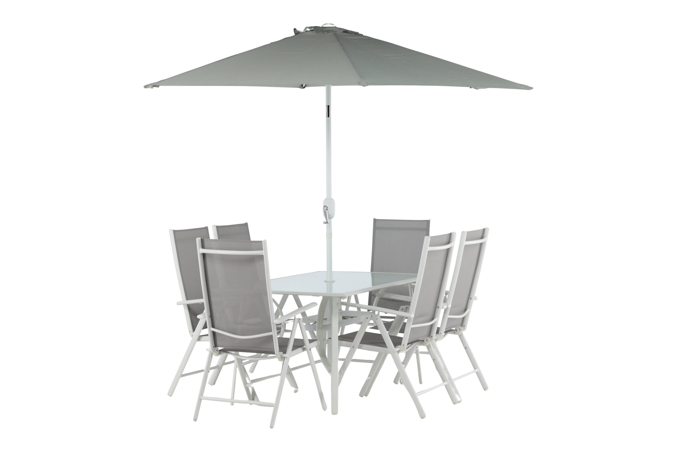 Svalka dig i skuggan ett tag i en modern matgrupp under ett smart parasoll! Matgruppen Brekki bjuder både på ett stilrent matbord med en bordsskiva i glas och raka ben i vit aluminium. Här tillsammans med fällbara matstolar med en sits i grå textilene och ram i vit aluminium. Parasollet sätts fast i mitten av bordet och är till för att skydda dig från solens varma strålar vid middagsbordet. Parasollet har ett vitt tyg med en stomme i aluminium. Det blir inte bättre än såhär!