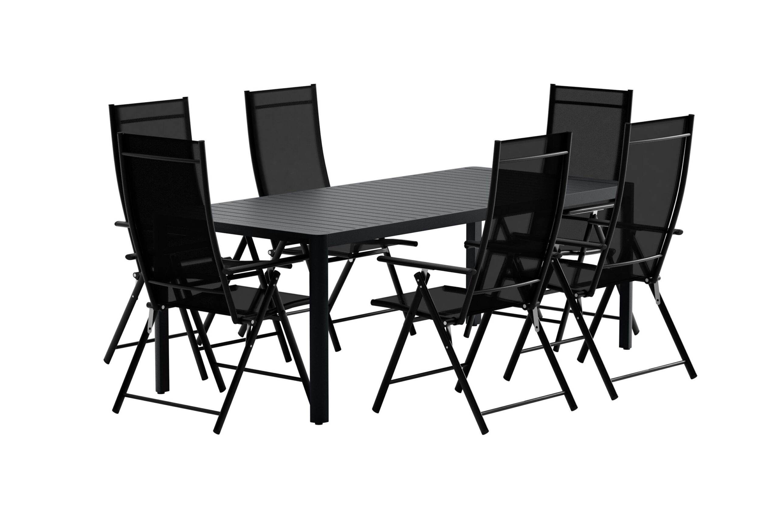 Skapa en modern och inbjudande matplats utomhus med matgruppen Lavenzo & Giardini. Denna kombination erbjuder både stil och funktion för dig som vill ha en trivsam miljö att njuta av alla sommarens måltider i. Lavenzo matstol har en svart stålram som ger ett modernt uttryck och en sits i textilene som är bekväm och enkel att sköta. Stolen är hopfällbar för smidig förvaring och det justerbara ryggstödet gör det enkelt att hitta en bekväm sittposition – perfekt för både måltider och avslappnade stunder på uteplatsen. Giardini matbord i svart är ett stilrent och rymligt bord med en rektangulär form som ger gott om plats för familj och vänner. Den ribbade bordsskivan ger bordet en elegant karaktär och blir en smakfull detalj som höjer hela uttrycket på terrassen eller i trädgården.