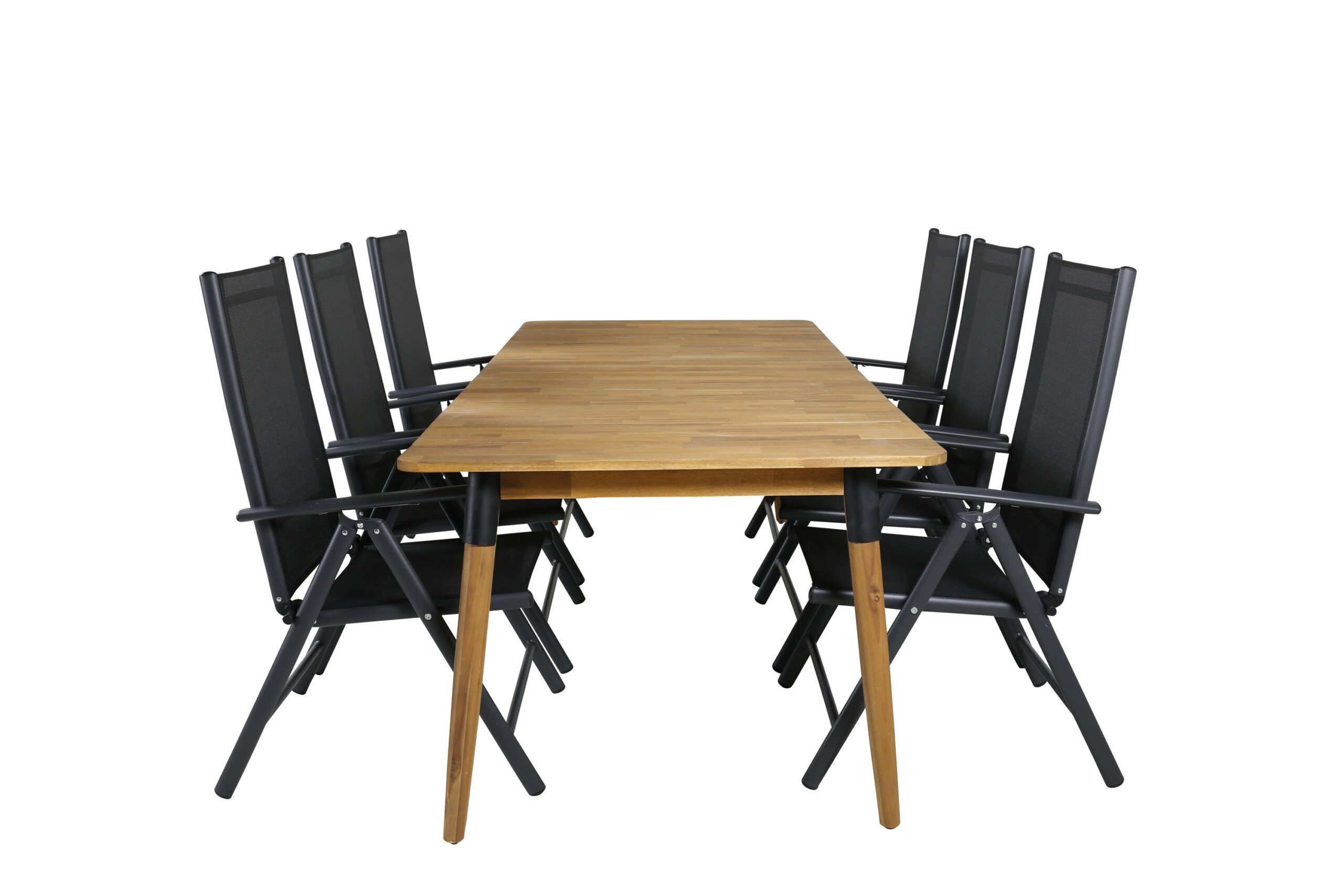 Matbord Julian har modernt utsvängda ben och klassisk design, tillverkad av akacia! Här tillsammans med de fällbara matstolarna Break i stilren svart kulör. Här sitter du och dina gäster bekvämt länge de sena sommarkvällarna!
