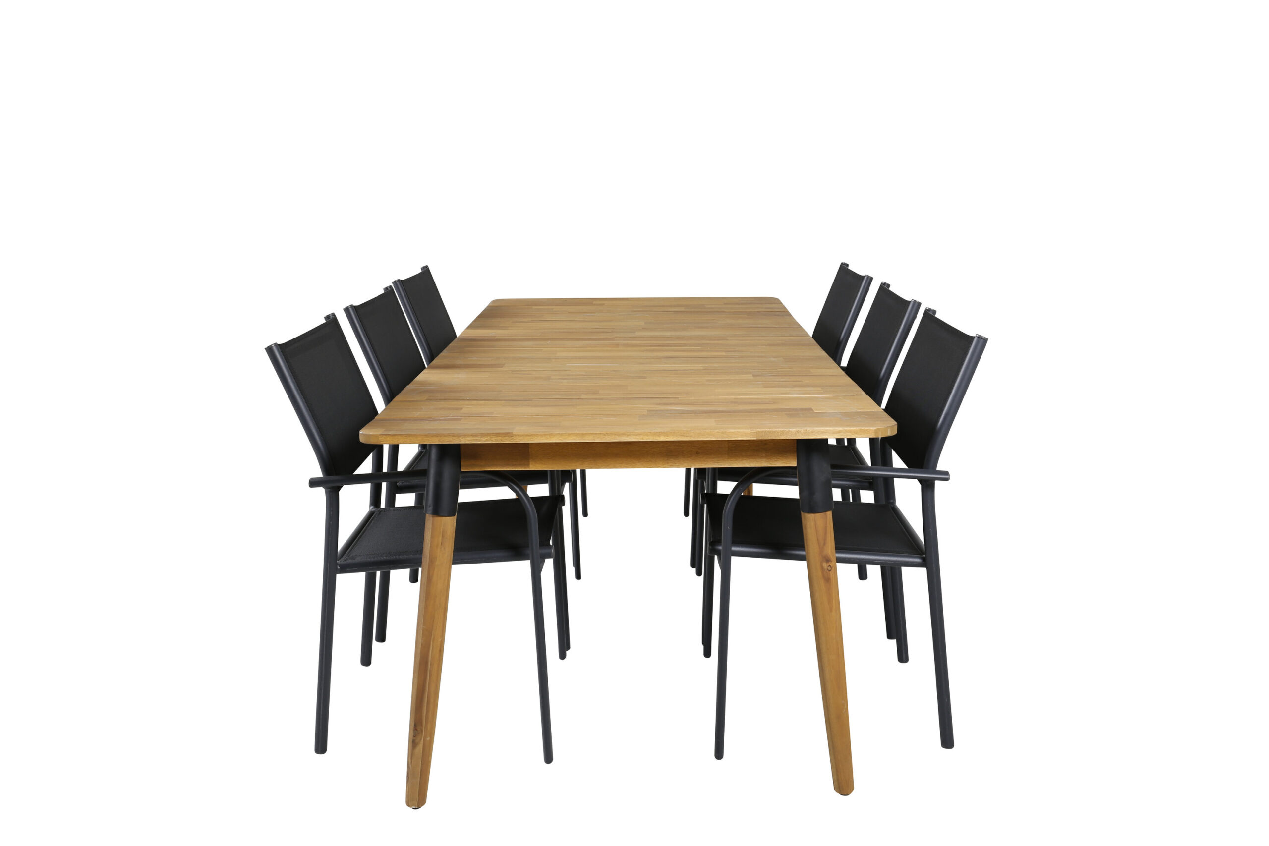 Matgrupp Utomhus – Venture Home Julian Matbord 210×100 Natur + 6 Santorini Karmstolar Svart