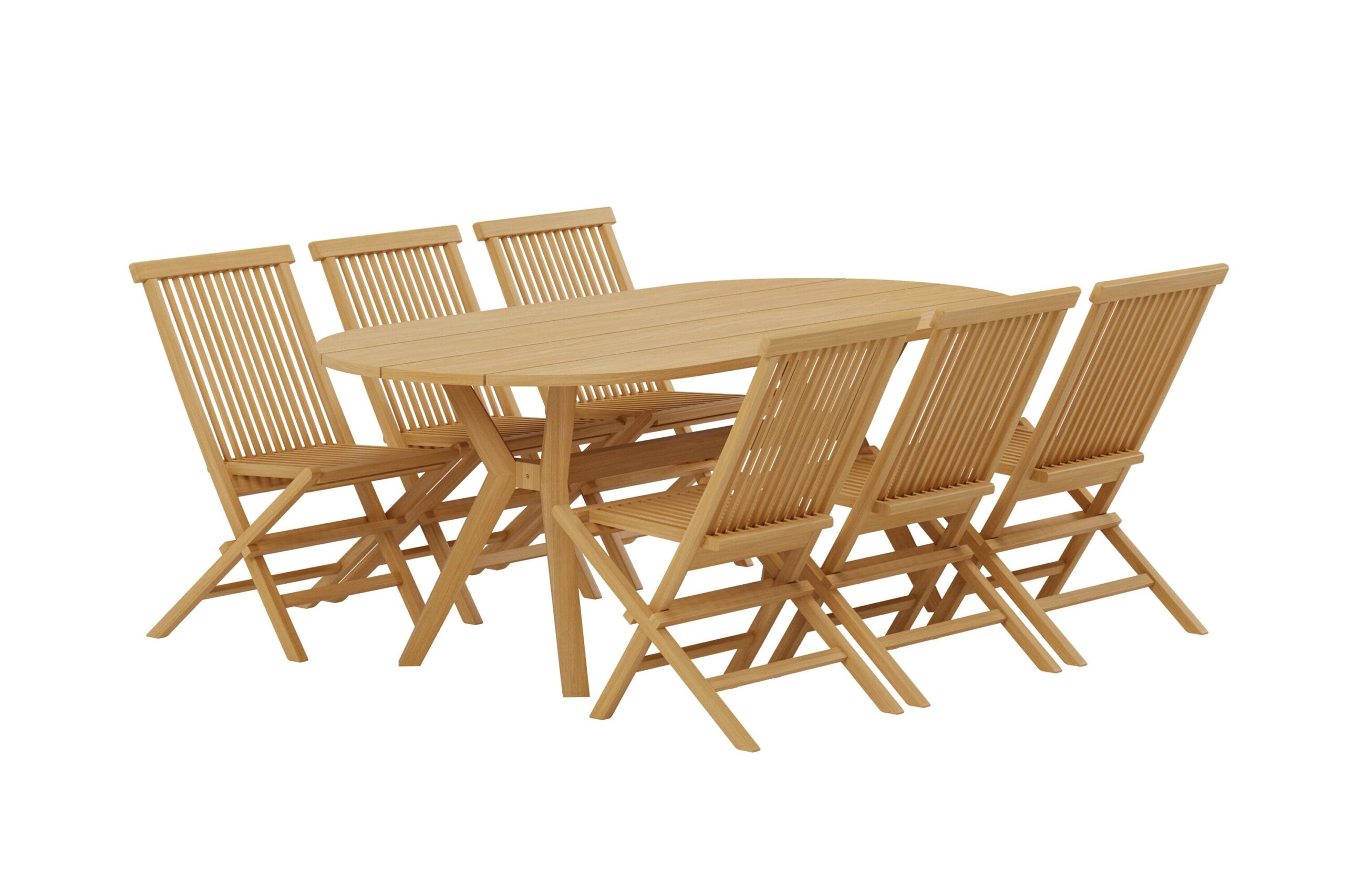 Skapa en varm, inbjudande och tidlös matplats med vår populära matgrupp Kenya. Den består av sex smakfulla matstolar i vacker teak samt ett stilrent teakbord som tillsammans bildar en harmonisk helhet för både uteplats och uterum. Kenya-stolen är en modern drömstol för sommarens alla stunder. Den är fällbar för enkel hantering och erbjuder hög komfort tack vare sin genomtänkta utformning. Den naturliga teakytan ger ett elegant uttryck som lyfter vilken utomhusmiljö som helst, och den tidlösa designen gör stolen lika funktionell som vacker. Det matchande Kenya matbordet fortsätter samma stilrena känsla. Med mjukt avrundade former och en varm teakfinish blir bordet snabbt hemmets naturliga samlingspunkt. De stabila benen och den gedigna konstruktionen gör det perfekt för såväl vardagsmiddagar som festliga tillfällen.