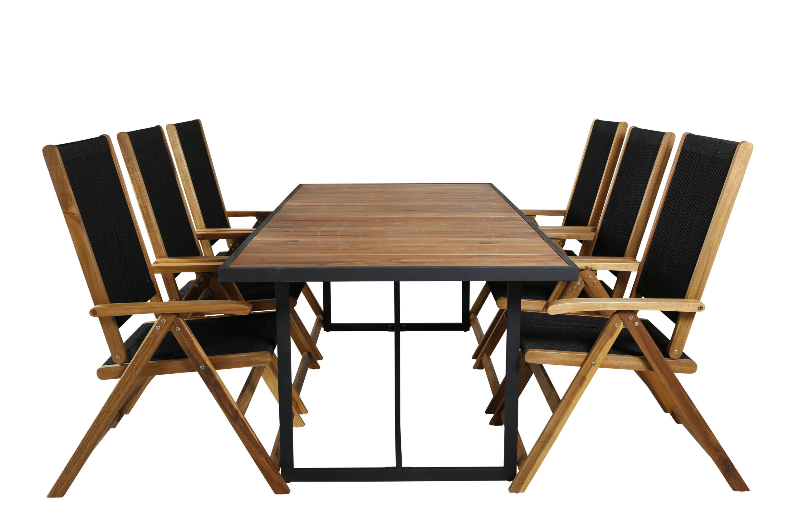 Matgrupp Utomhus – Venture Home Khung Matbord 200×100 Svart/Natur + 6 Little John Matstolar Svart/Natur