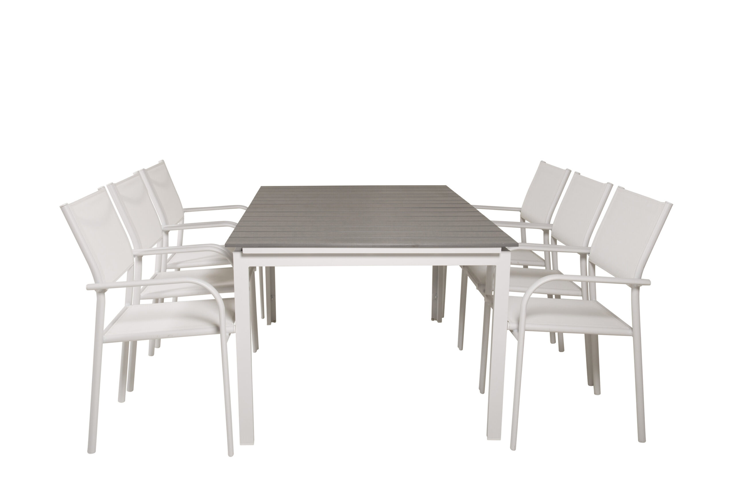 Det förlängningsbara matbordet Levels i en snygg och modern design. Till bordet medföljer våra vita matstolar Santorini. Här får du en kombination som skapar en varm, naturlig och inbjudande känsla till uterummet eller altanen. Utöka dina middagsbjudningar och slipp oroa dig över att alla ska få plats!