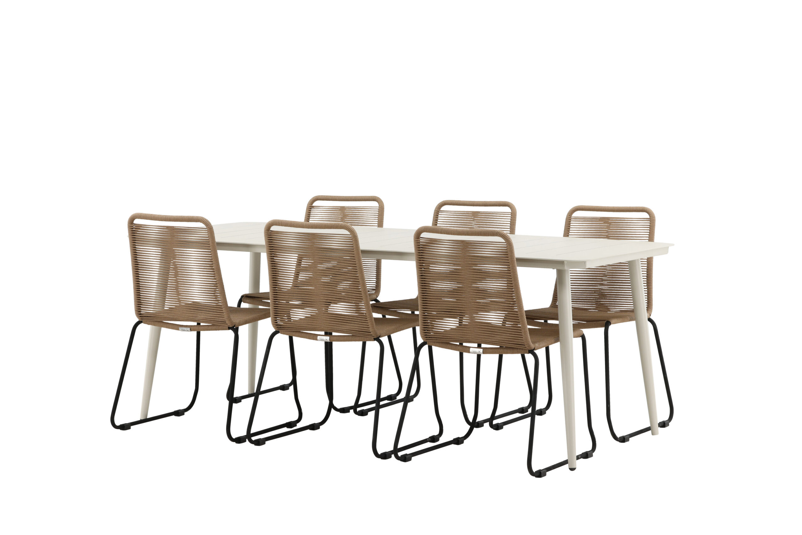 Skapa ett modernt blickfång i uterummet! Matbord Lina har en minimalistiskt konstruktion i vitt stål med en rektangulär bordsskiva och lätt utsvängda ben. Här tillsammans med våra populära matstolar från serien Lindos. Stolen är tillverkad av slitstarka material med en sits i rep i en jordnära beige nyans och ben i svart metall. Här får du en matgrupp som både är bekväm och en fröjd för ögat! Bordets mått: 200x90cm.