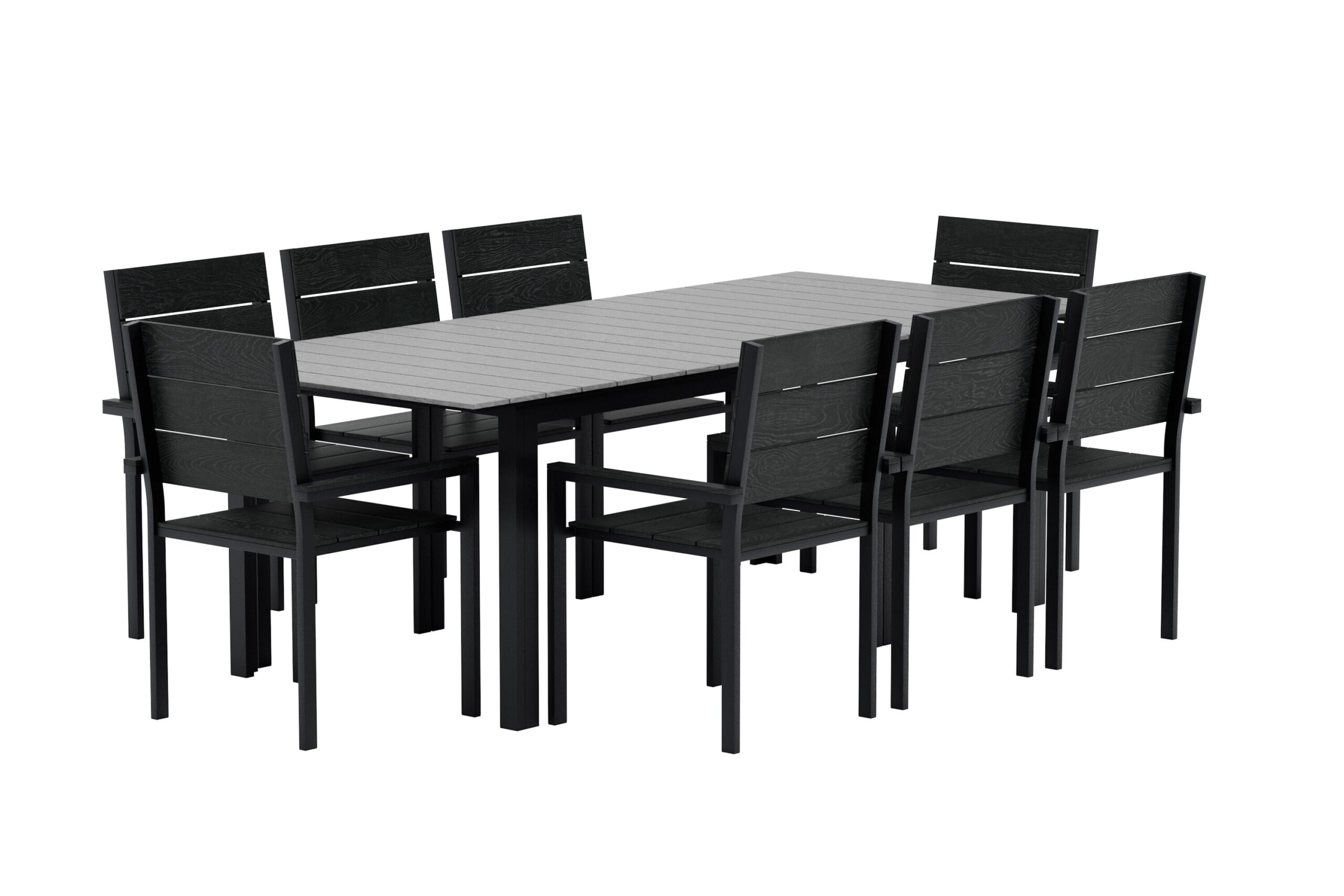 Skapa en stilren och funktionell matplats utomhus med denna moderna matgrupp i Levels-serien. Levels karmstol är en robust och praktisk stol i svart aluminium med sits och rygg i smäcker aintwood. Den stilrena designen med raka nordiska linjer ger ett modernt intryck, medan den stapelbara funktionen gör förvaringen enkel. En perfekt stol för många sköna sommarmiddagar. Levels matbord är ett rektangulärt och förlängningsbart bord som erbjuder gott om plats när sällskapet blir större. Den grå bordsskivan i aintwood kombineras med en svart metallstomme för ett hållbart, snyggt och väderbeständigt uttryck – idealiskt för utomhusbruk. Tillsammans bildar bordet och de 8 karmstolarna en hållbar, modern och inbjudande matgrupp som passar perfekt för sommarens alla utomhusmåltider.